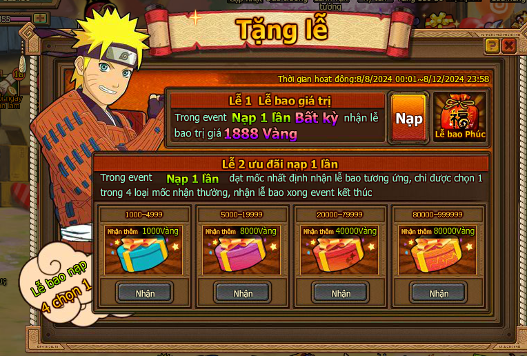 Trong sự kiện này, Nạp Đơn đạt mốc nhất định nhận lễ bao tương ứng, chỉ được chọn 1 trong 4 loại mốc nhận thưởng, nhận lễ bao xong sự kiện kết thúc.