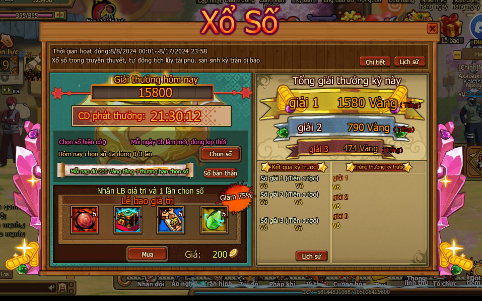 Note : Trước và sau 15 phút thời gian phát thưởng , giải thưởng tạm không làm mới nữa . Mỗi người chơi trong thời gian event chỉ có thể tham dự 1 lần giải thưởng may mắn trả lễ Vàng.