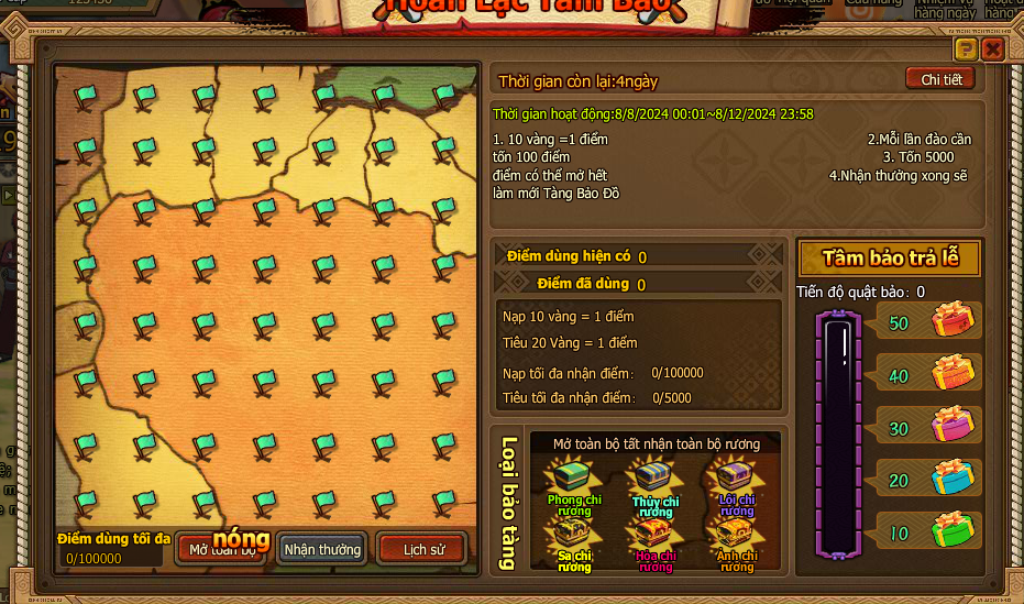 5. Trong thời gian event , nạp 1 lần đầu tiên thỏa nhận thêm bảo tàng khoáng . Trong thời gian , thống kê mức nạp của người chơi toan sv đến giải thưởng may mắn , Mổi nạp 1 Vàng giải thưởng tăng 1 Vàng , mỗi ngày 12:00, 18:00, 22:00 rút ngẫu nhiên 3 người chơi may mắn trong người chơi nạp thẻ toàn sv trả lễ Vàng