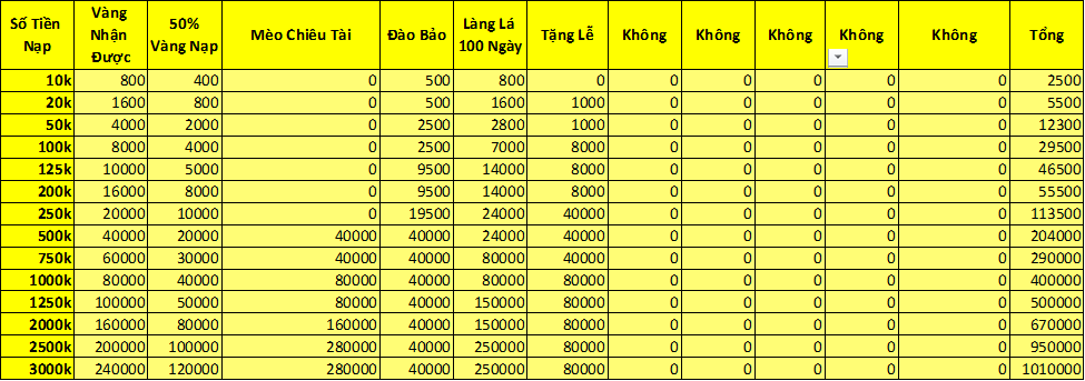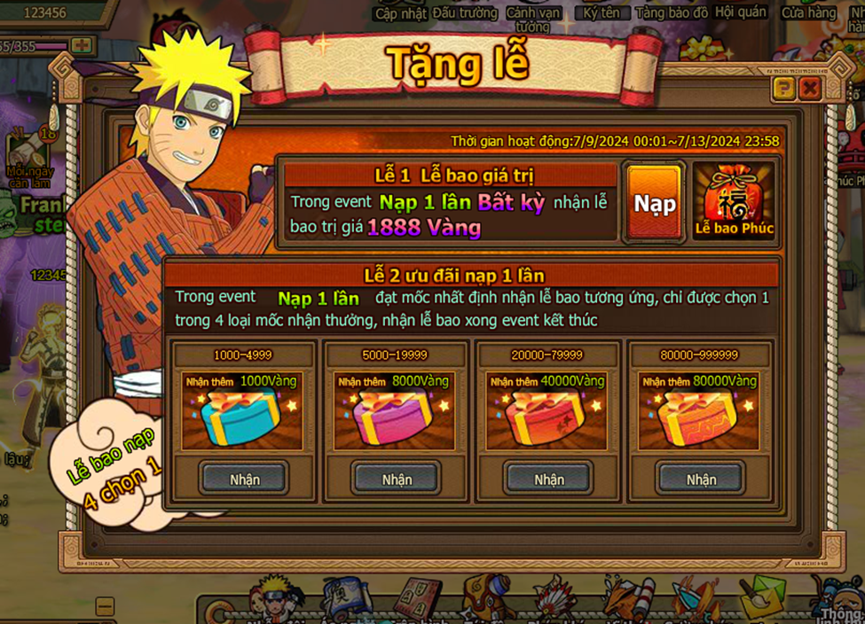 Trong thời gian event nạp 1 lần đạt mức chỉ định , nhận trả lễ vàng