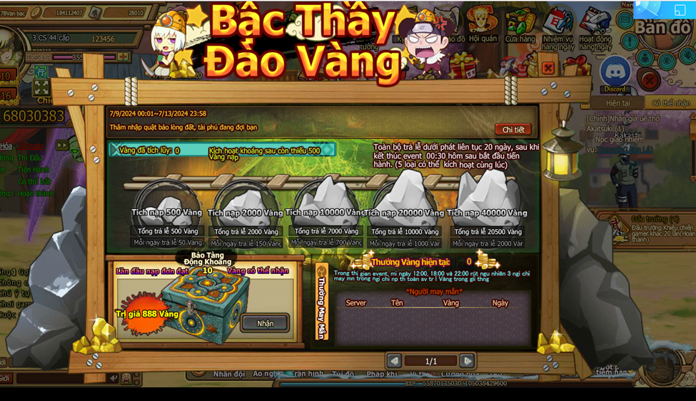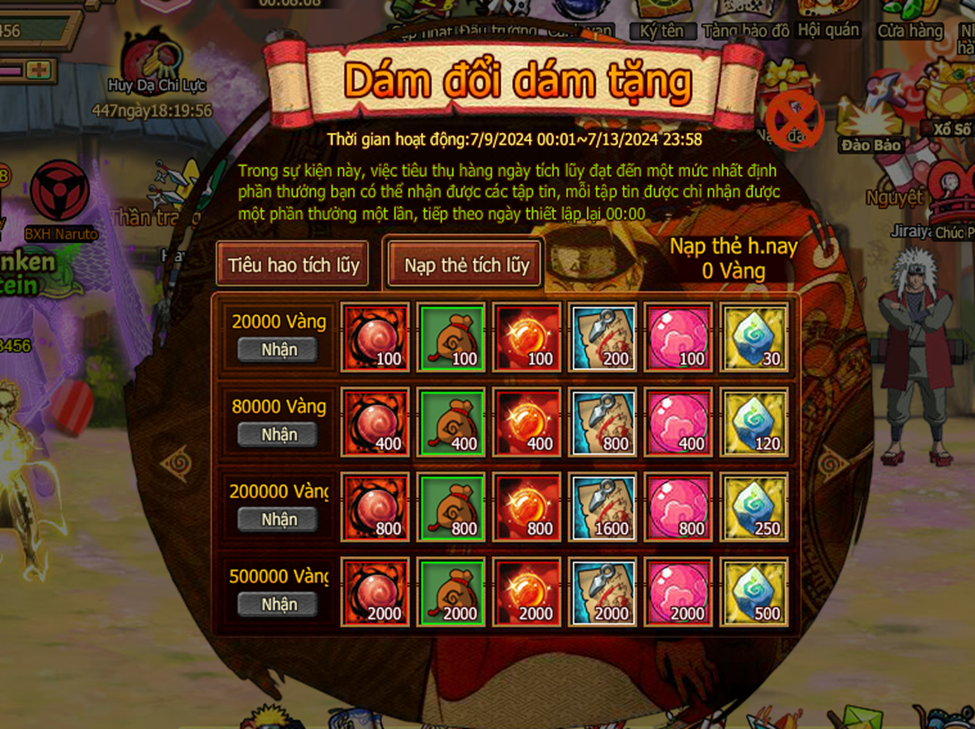 5. Trong thời gian event , nạp 1 lần đầu tiên thỏa nhận thêm bảo tàng khoáng . Trong thời gian , thống kê mức nạp của người chơi toan sv đến giải thưởng may mắn , Mổi nạp 1 Vàng giải thưởng tăng 1 Vàng , mỗi ngày 12:00, 18:00, 22:00 rút ngẫu nhiên 3 người chơi may mắn trong người chơi nạp thẻ toàn sv trả lễ Vàng