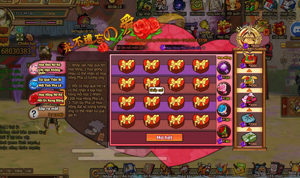 2. Mỗi 16 hộp quà mở ra có thể nhận 4 loại hoa hồng mỗi loại 2 nhóm (200 Hoa Hồng Pha Lê).