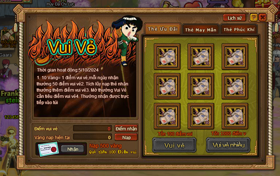 1. 10 Vàng = 1 điểm vui vẻ, mỗi ngày nhận thưởng 50 điểm vui vẻ