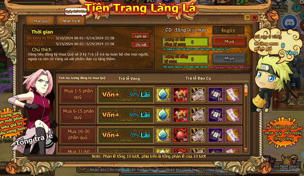 Người chơi căn cứ số phần mua Quỹ mỗi ngày nhận 1 lần Quỹ thưởng trả lễ , trả lễ bao gồm trả lễ vàng và đạo cụ