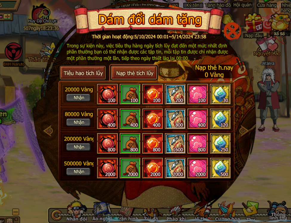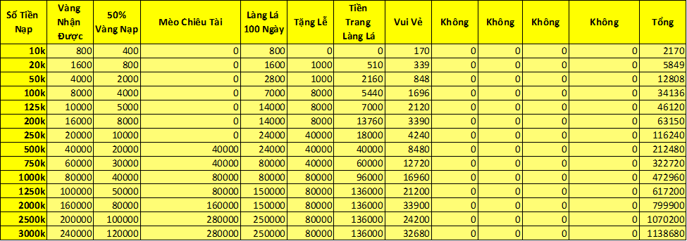 Trong thời gian event nạp 1 lần đạt mức chỉ định , nhận trả lễ vàng