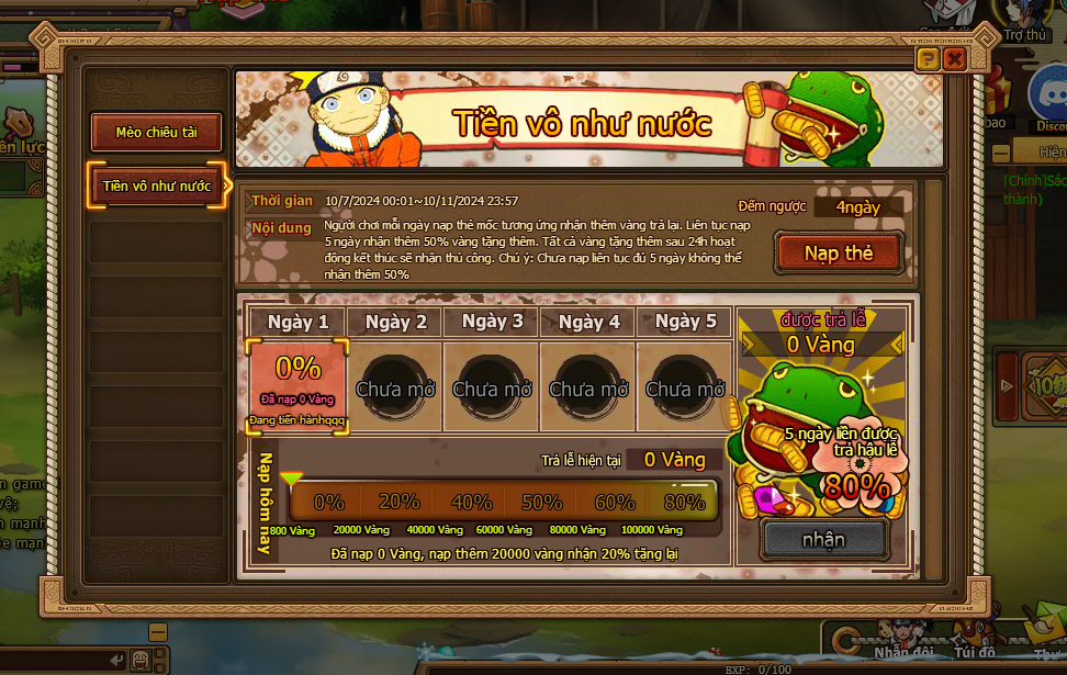 1. Người chơi mỗi ngày nạp thẻ mốc tương ứng nhận thêm vàng trả lại. Liên tục nạp 5 ngày nhận thêm 80% vàng tặng thêm. Tất cả vàng tặng thêm sau 24h hoạt động kết thúc sẽ nhận thủ công. Chú ý: Chưa nạp liên tục đủ 5 ngày không thể nhận thêm 80%.