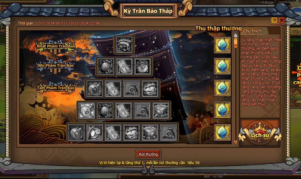 1. Từ tầng thấp nhất, mỗi rút trúng 1 phần thưởng, sẽ điểm sáng phần thưởng biểu tượng đạo cụ đó đều được điểm sáng, sẽ leo lên 1 tầng, đồng thời nhận thưởng thu thập tầng tương ứng.