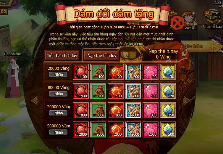 Trong thời gian event nạp 1 lần đạt mức chỉ định , nhận trả lễ vàng
