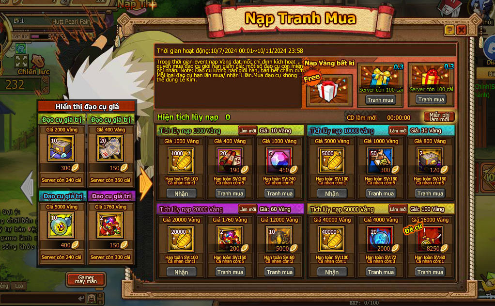 1. Trong thời gian event nạp Vàng đạt mốc chỉ định kích hoạt quyền mua đạo cụ giới hạn giảm giá: một số đạo cụ còn miễn phí nhận.