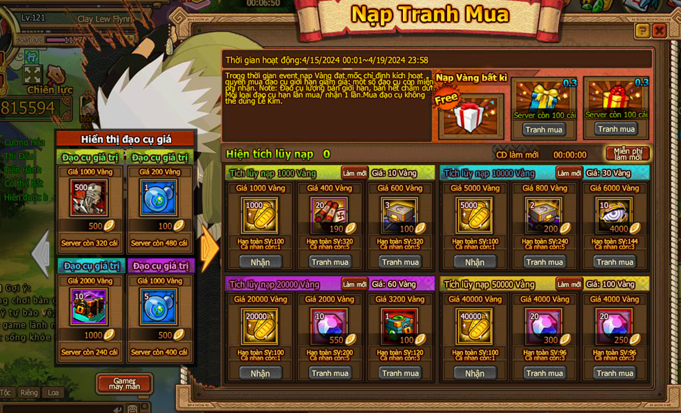 1. Trong thời gian event nạp Vàng đạt mốc chỉ định kích hoạt quyền mua đạo cụ giới hạn giảm giá: một số đạo cụ còn miễn phí nhận.