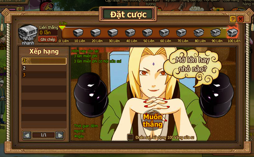 2. Thi đấu bắt đầu khi người chơi điểm số mình lớn hơn hay nhở hơn điểm của Tsunade, nhấn vào nút Lớn hoặc Nhỏ.