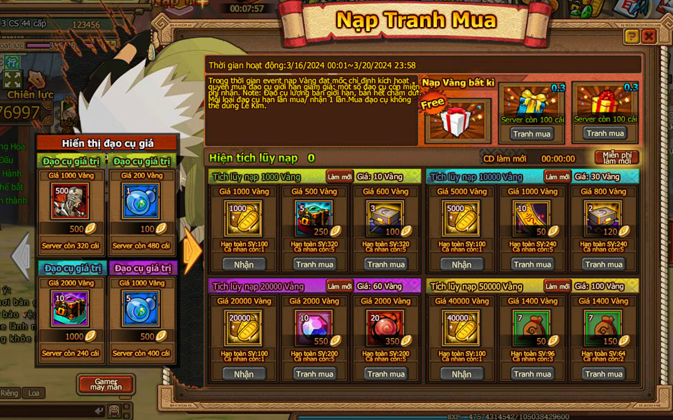 1. Trong thời gian event nạp Vàng đạt mốc chỉ định kích hoạt quyền mua đạo cụ giới hạn giảm giá: một số đạo cụ còn miễn phí nhận.
