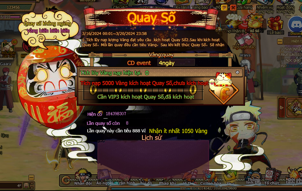 1. Tích lũy nạp lượng vàng đạt yêu cầu kích hoạt Quay Số.