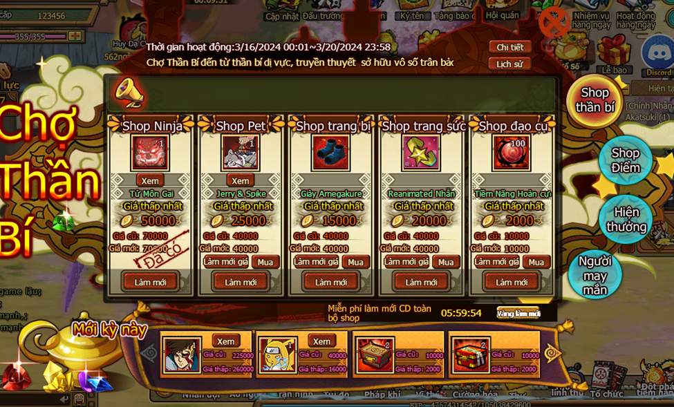 2. Trong chợ thần bí có 5 loại shop , phân biệt gồm shop ninja , shop pet , shop trang bị , shop trang sức và shop đạo cụ , mỗi shop đều bán loại vật phẩm tương ứng