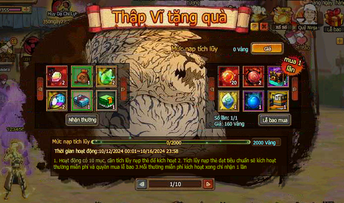 1. Hoạt động có 10 mục, cần tích lũy nạp thẻ để kích hoạt.