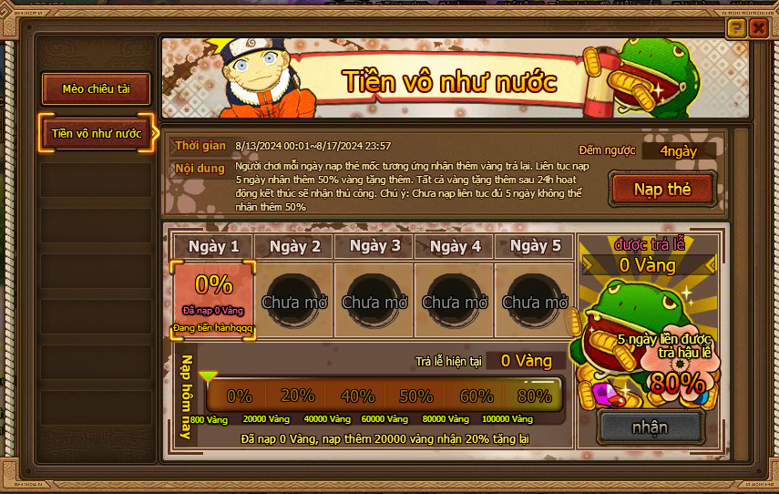 1. Người chơi mỗi ngày nạp thẻ mốc tương ứng nhận thêm vàng trả lại. Liên tục nạp 5 ngày nhận thêm 80% vàng tặng thêm. Tất cả vàng tặng thêm sau 24h hoạt động kết thúc sẽ nhận thủ công. Chú ý: Chưa nạp liên tục đủ 5 ngày không thể nhận thêm 80%.