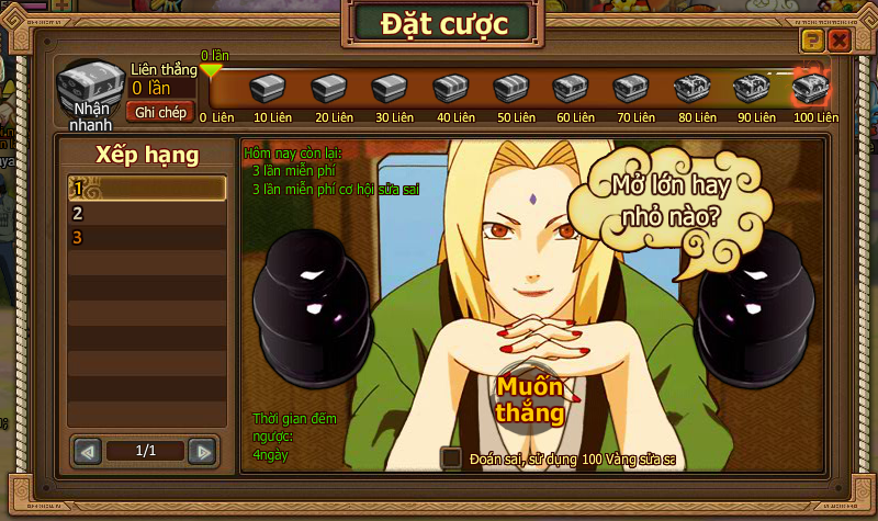 2. Thi đấu bắt đầu khi người chơi điểm số mình lớn hơn hay nhở hơn điểm của Tsunade, nhấn vào nút Lớn hoặc Nhỏ.