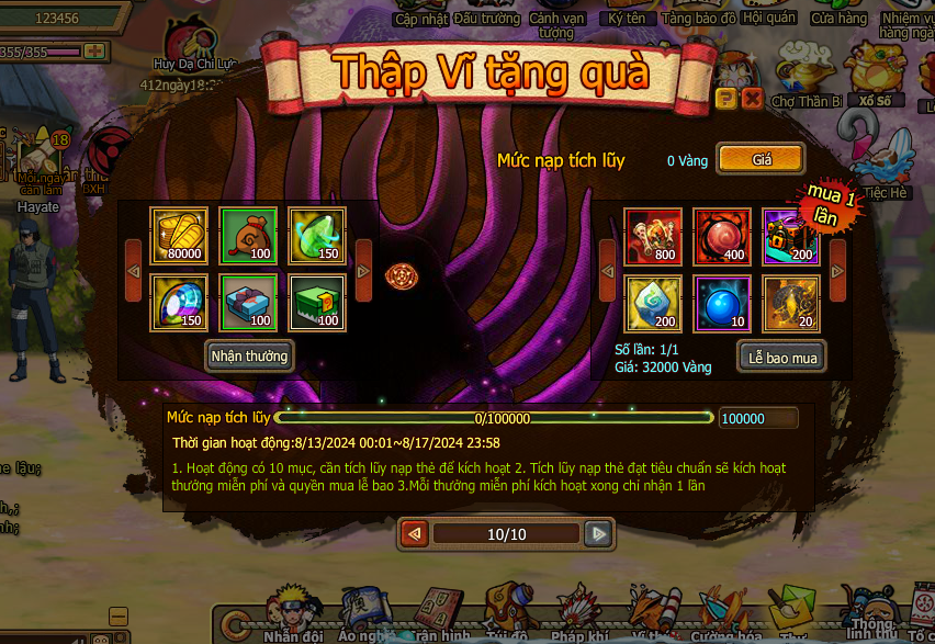1. Hoạt động có 10 mục, cần tích lũy nạp thẻ để kích hoạt.