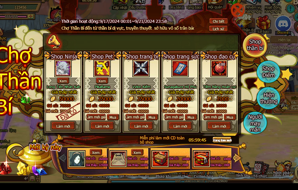 2. Trong chợ thần bí có 5 loại shop , phân biệt gồm shop ninja , shop pet , shop trang bị , shop trang sức và shop đạo cụ , mỗi shop đều bán loại vật phẩm tương ứng