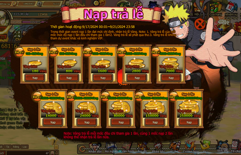 Trong thời gian event nạp 1 lần đạt mức chỉ định , nhận trả lễ vàng