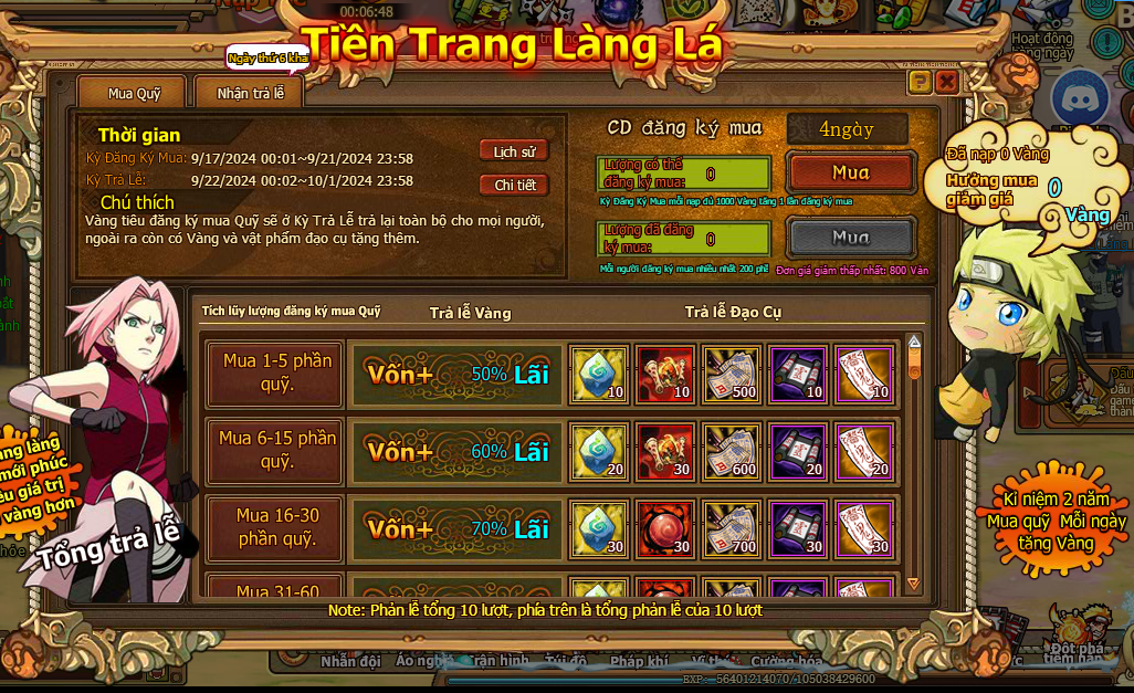 Người chơi căn cứ số phần mua Quỹ mỗi ngày nhận 1 lần Quỹ thưởng trả lễ , trả lễ bao gồm trả lễ vàng và đạo cụ