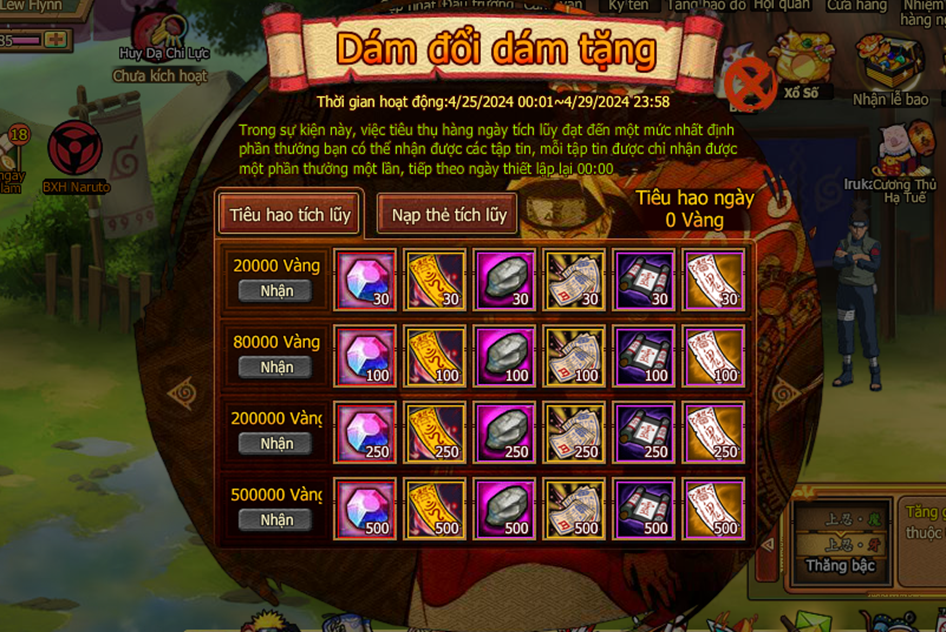 Trong thời gian event nạp 1 lần đạt mức chỉ định , nhận trả lễ vàng