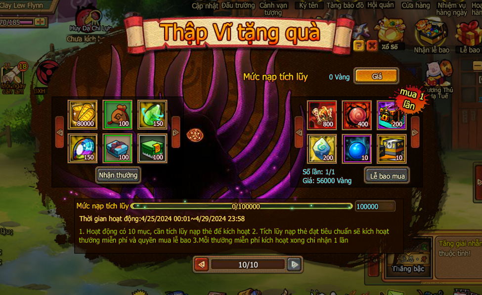 1. Hoạt động có 10 mục, cần tích lũy nạp thẻ để kích hoạt.