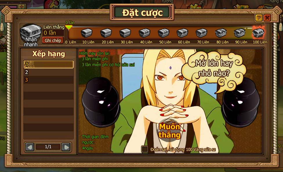 2. Thi đấu bắt đầu khi người chơi điểm số mình lớn hơn hay nhở hơn điểm của Tsunade, nhấn vào nút Lớn hoặc Nhỏ.