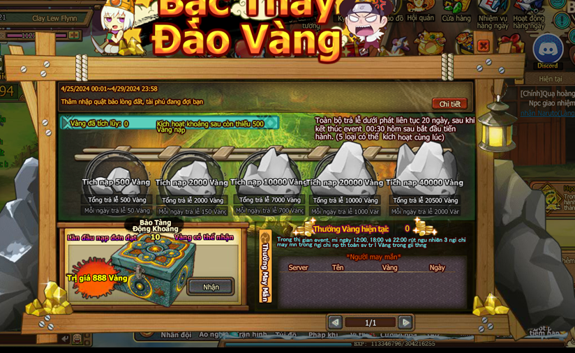 5. Trong thời gian event , nạp 1 lần đầu tiên thỏa nhận thêm bảo tàng khoáng . Trong thời gian , thống kê mức nạp của người chơi toan sv đến giải thưởng may mắn , Mổi nạp 1 Vàng giải thưởng tăng 1 Vàng , mỗi ngày 12:00, 18:00, 22:00 rút ngẫu nhiên 3 người chơi may mắn trong người chơi nạp thẻ toàn sv trả lễ Vàng