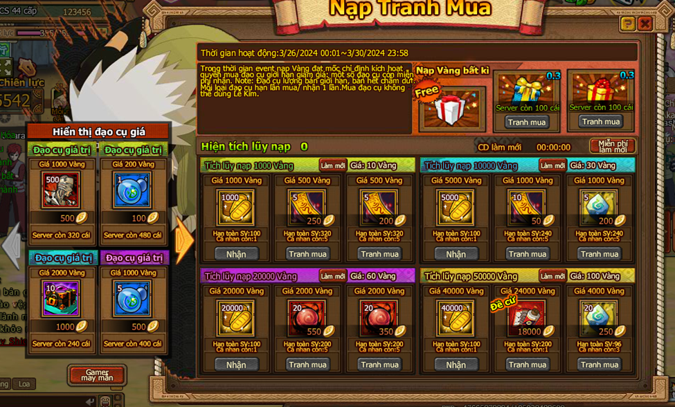 1. Trong thời gian event nạp Vàng đạt mốc chỉ định kích hoạt quyền mua đạo cụ giới hạn giảm giá: một số đạo cụ còn miễn phí nhận.