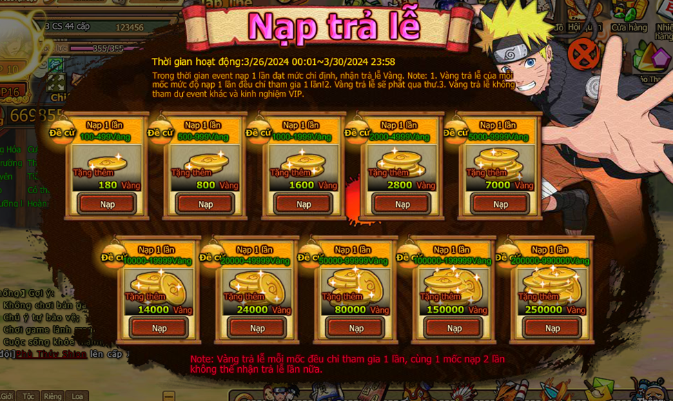 Trong thời gian event nạp 1 lần đạt mức chỉ định , nhận trả lễ vàng