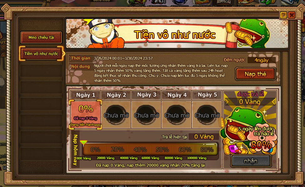 1. Người chơi mỗi ngày nạp thẻ mốc tương ứng nhận thêm vàng trả lại. Liên tục nạp 5 ngày nhận thêm 80% vàng tặng thêm. Tất cả vàng tặng thêm sau 24h hoạt động kết thúc sẽ nhận thủ công. Chú ý: Chưa nạp liên tục đủ 5 ngày không thể nhận thêm 80%.