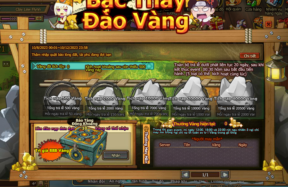 5. Trong thời gian event , nạp 1 lần đầu tiên thỏa nhận thêm bảo tàng khoáng . Trong thời gian , thống kê mức nạp của người chơi toan sv đến giải thưởng may mắn , Mổi nạp 1 Vàng giải thưởng tăng 1 Vàng , mỗi ngày 12:00, 18:00, 22:00 rút ngẫu nhiên 3 người chơi may mắn trong người chơi nạp thẻ toàn sv trả lễ Vàng