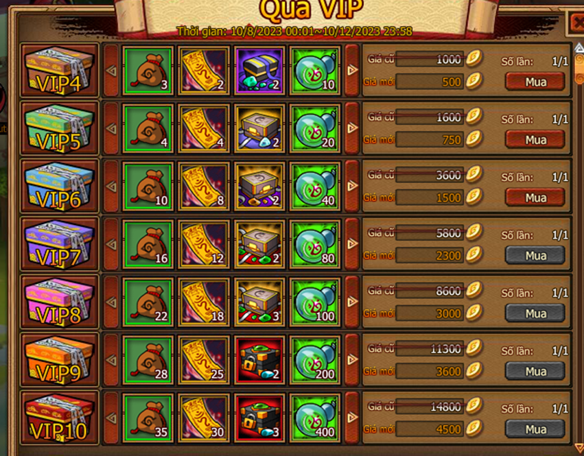 Cấp vip tương ứng sẽ được mua , mua bằng vàng hoặc lễ kim