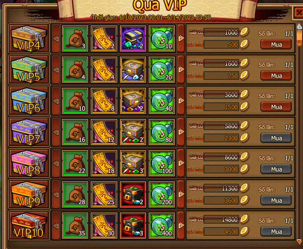 Cấp vip tương ứng sẽ được mua , mua bằng vàng hoặc lễ kim