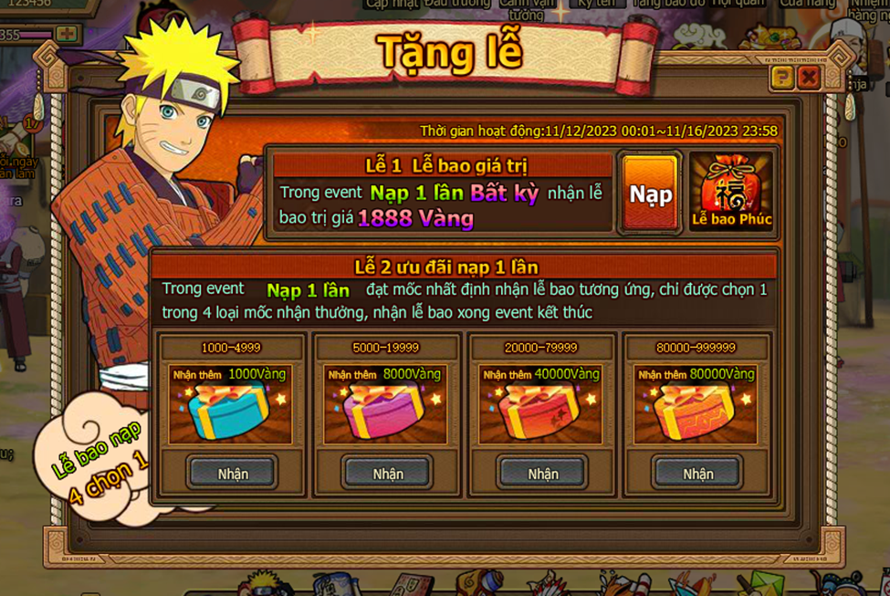 Trong thời gian event nạp 1 lần đạt mức chỉ định , nhận trả lễ vàng .