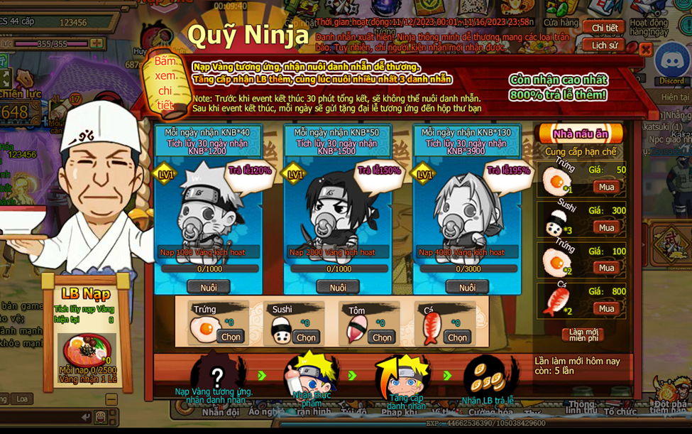 1. Người chơi nạp vàng , kích hoạt quỹ ninja : kích hoạt naruto cần nạp 2500 vàng , kích hoạt sasuke cần nạp 5000 vàng , kích hoạt sakura cần nạp 10000 vàng