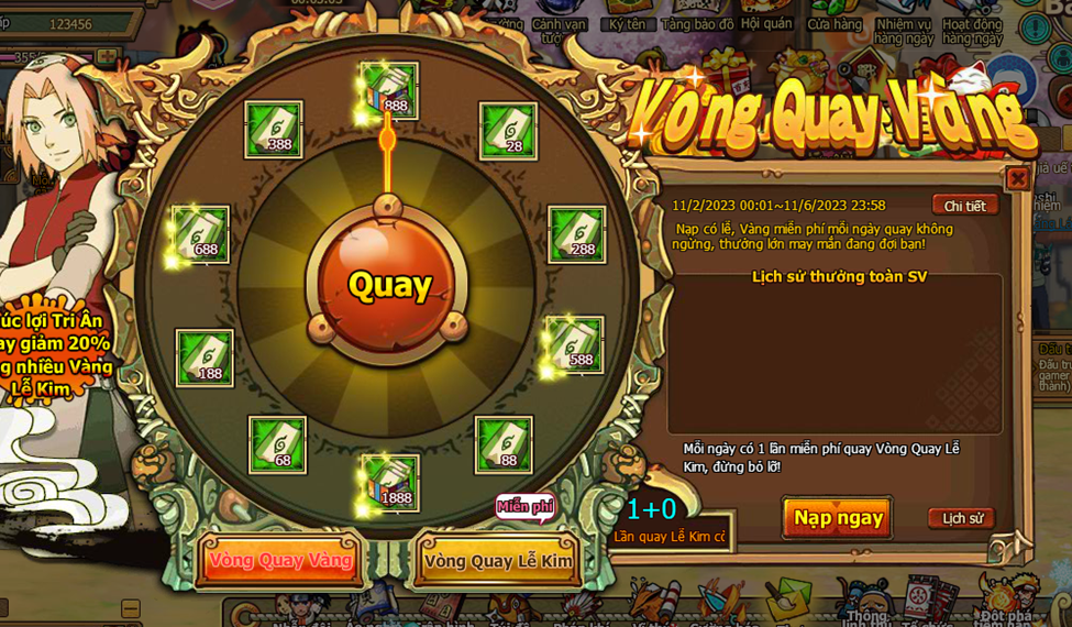1. Trong thời gian event , người chơi nạp đủ 500 vàng nhận 1 lần cơ hội quay (vòng quay vàng)
