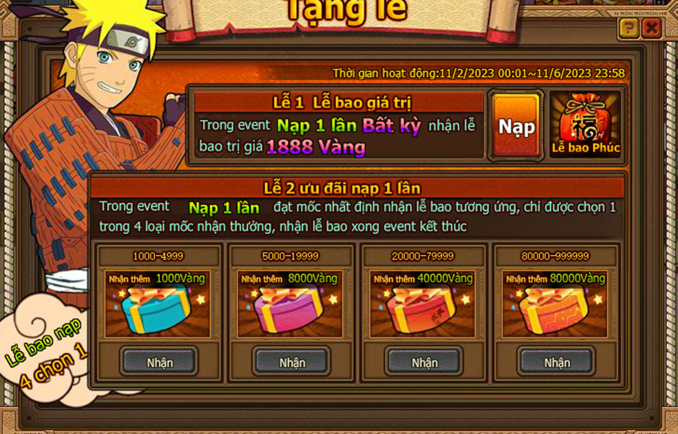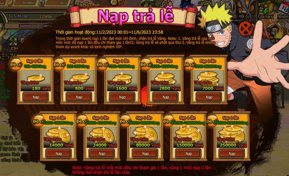 Trong thời gian event nạp 1 lần đạt mức chỉ định , nhận trả lễ vàng .
