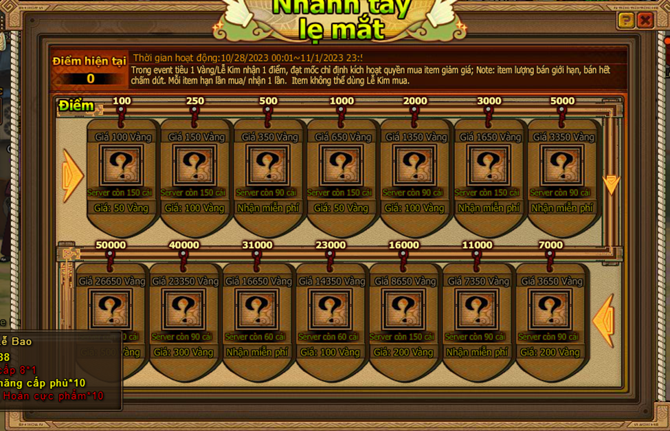 Trong event tiêu 1 vàng/ lễ kim nhận 1 điểm , đạt mốc chỉ định kích hoạt quyền mua item giảm giá