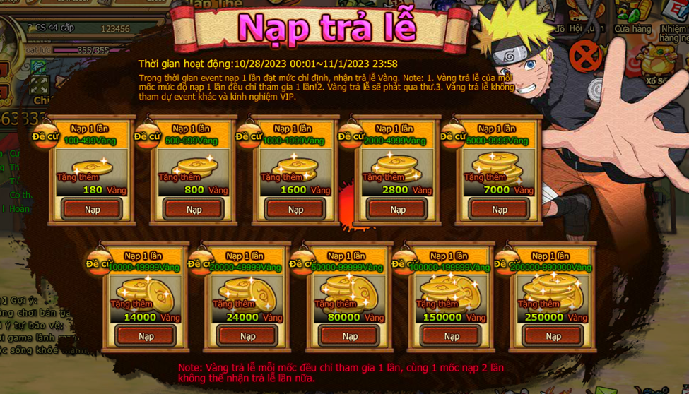 Trong thời gian event nạp 1 lần đạt mức chỉ định, nhận trả lễ vàng