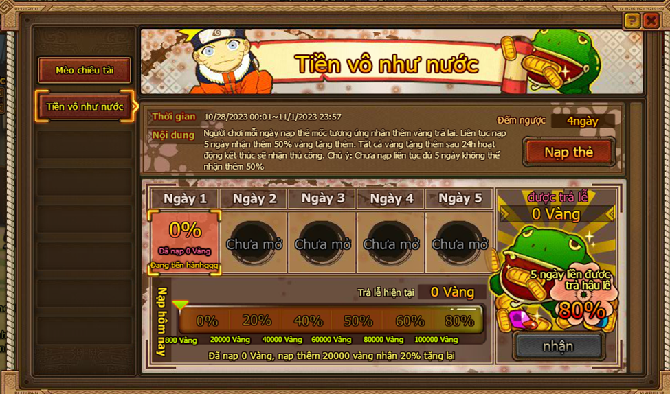 1. Người chơi mỗi ngày nạp thẻ mốc tương ứng nhận thêm vàng trả lại. Liên tục nạp 5 ngày nhận thêm 80% vàng tặng thêm. Tất cả vàng tặng thêm sau 24h hoạt động kết thúc sẽ nhận thủ công. Chú ý: Chưa nạp liên tục đủ 5 ngày không thể nhận thêm 80%.