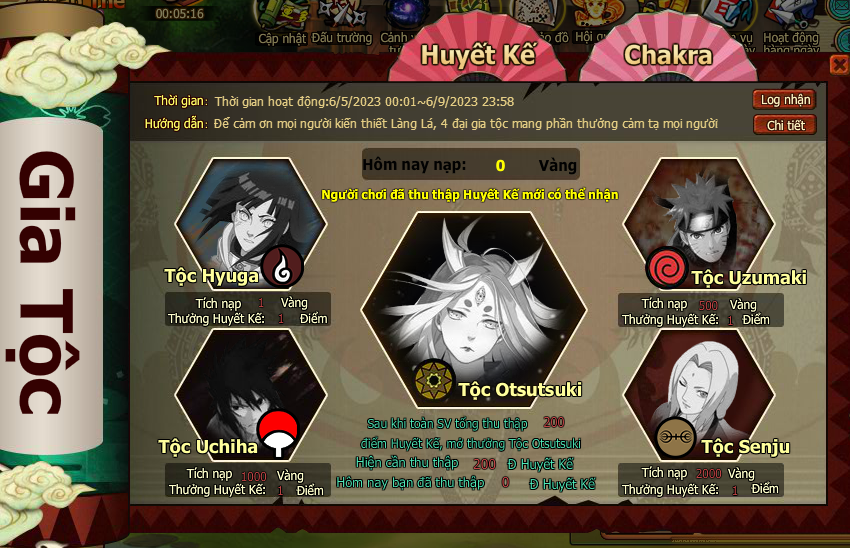 1. Trong thời gian hoạt động mỗi ngày tích lũy nạp đủ mốc tương ứng, mở 4 đại gia tộc, nhận thưởng Huyết kế tương ứng. 4 đại gia tộc gồm: Tộc Hyuga, Tộc Uzumaki, Tộc Uchiha, Tộc Senju.