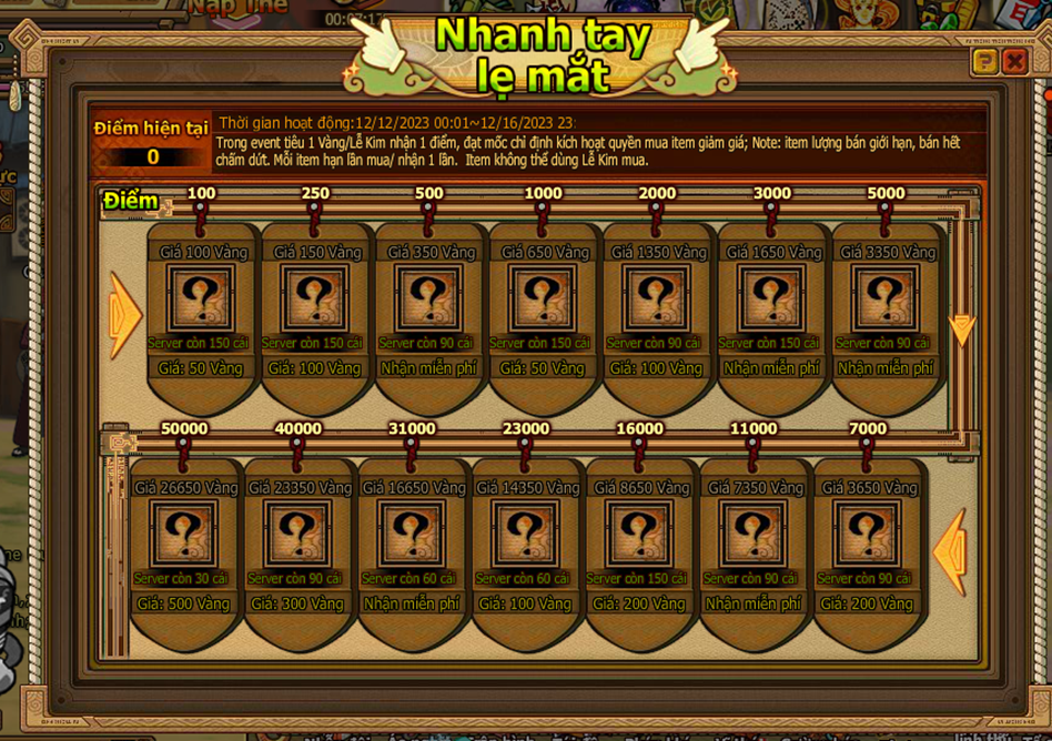Note : Item lượng bán giới hạn , bán hết chấm dứt . Mỗi item hạn 1 lần mua / nhận. Item không thể dùng lễ kim mua