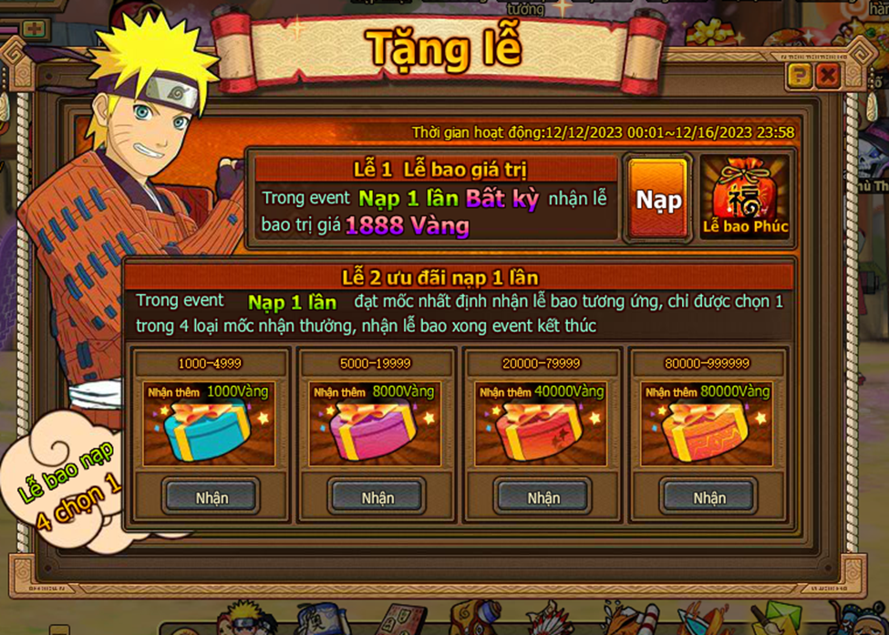 Trong thời gian event nạp 1 lần đạt mức chỉ định , nhận trả lễ vàng .