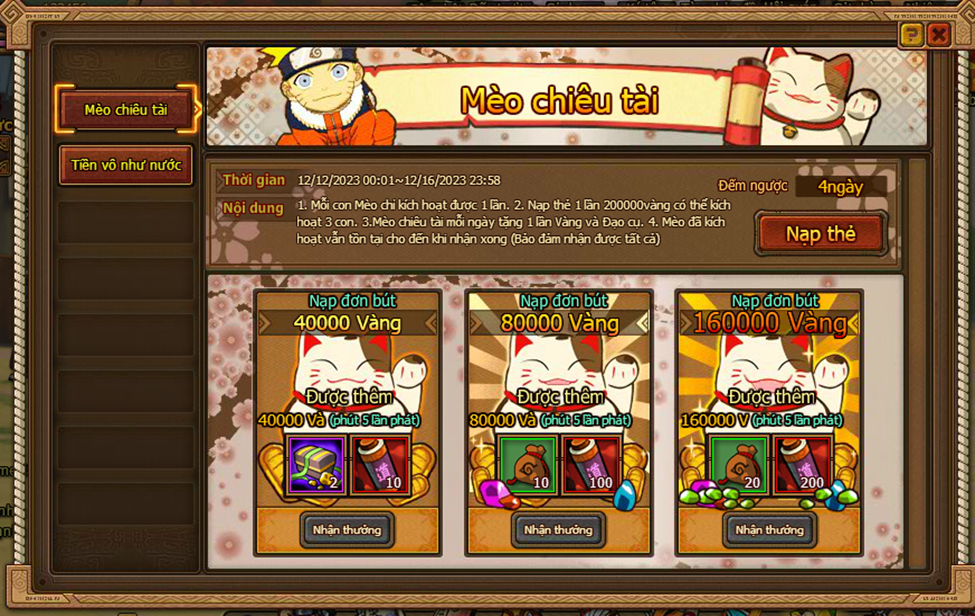 3. Mèo chiêu tài mỗi ngày tặng 1 lần Vàng và đạo cụ.