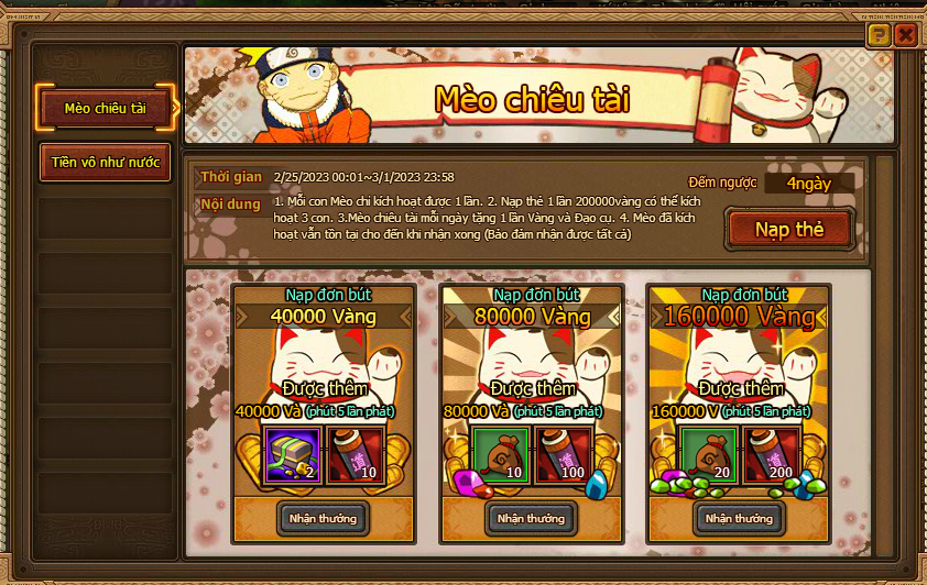 3. Mèo chiêu tài mỗi ngày tặng 1 lần Vàng và đạo cụ.