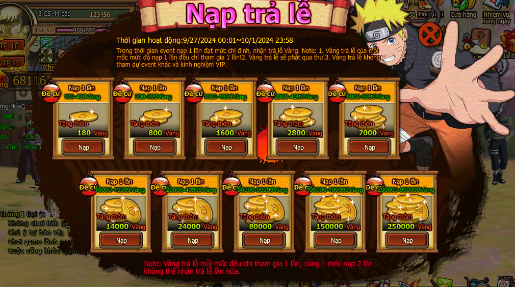 Trong thời gian event nạp 1 lần đạt mức chỉ định , nhận trả lễ vàng