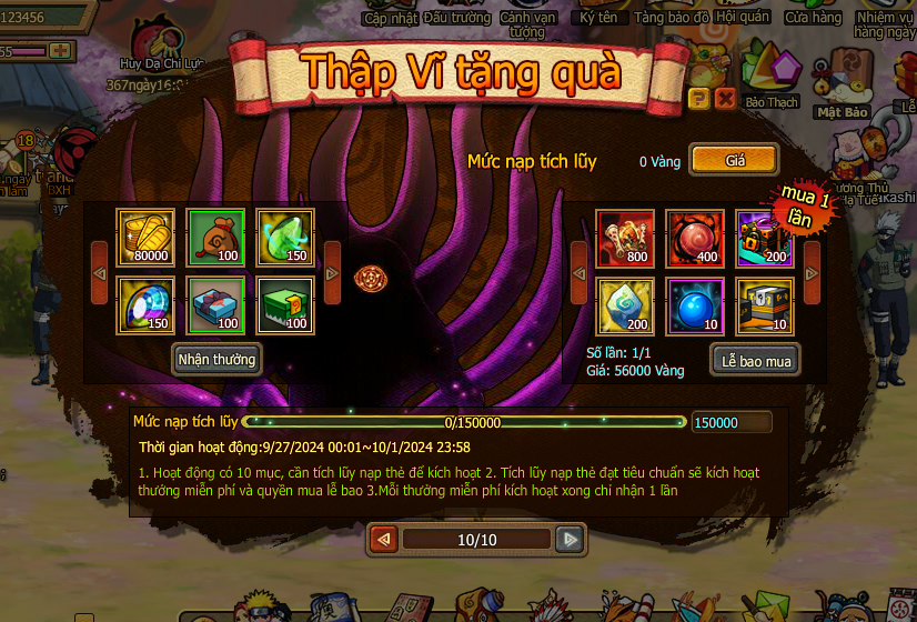 1. Hoạt động có 10 mục, cần tích lũy nạp thẻ để kích hoạt.