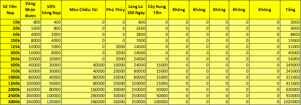 Trong thời gian event nạp 1 lần đạt mức chỉ định , nhận trả lễ vàng